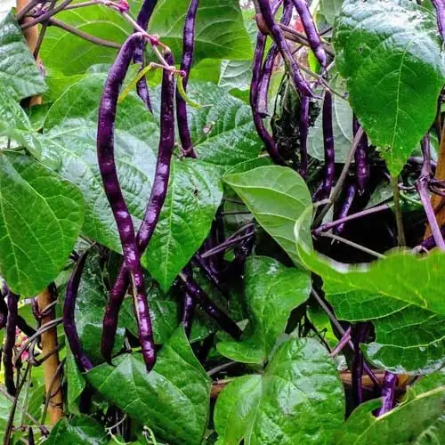 Beschreibung: Die Stangenbohne 'Blauhilde' ist eine ertragreiche und robuste Sorte mit langen, dunkelblauen Hülsen, die beim Kochen zu einem kräftigen Grün verfärben. Sie ist fadenlos, hat einen guten Geschmack und ist gut für den Verzehr geeignet. Außerdem hat sie einen schönen Zierwert durch ihre violetten Blüten.