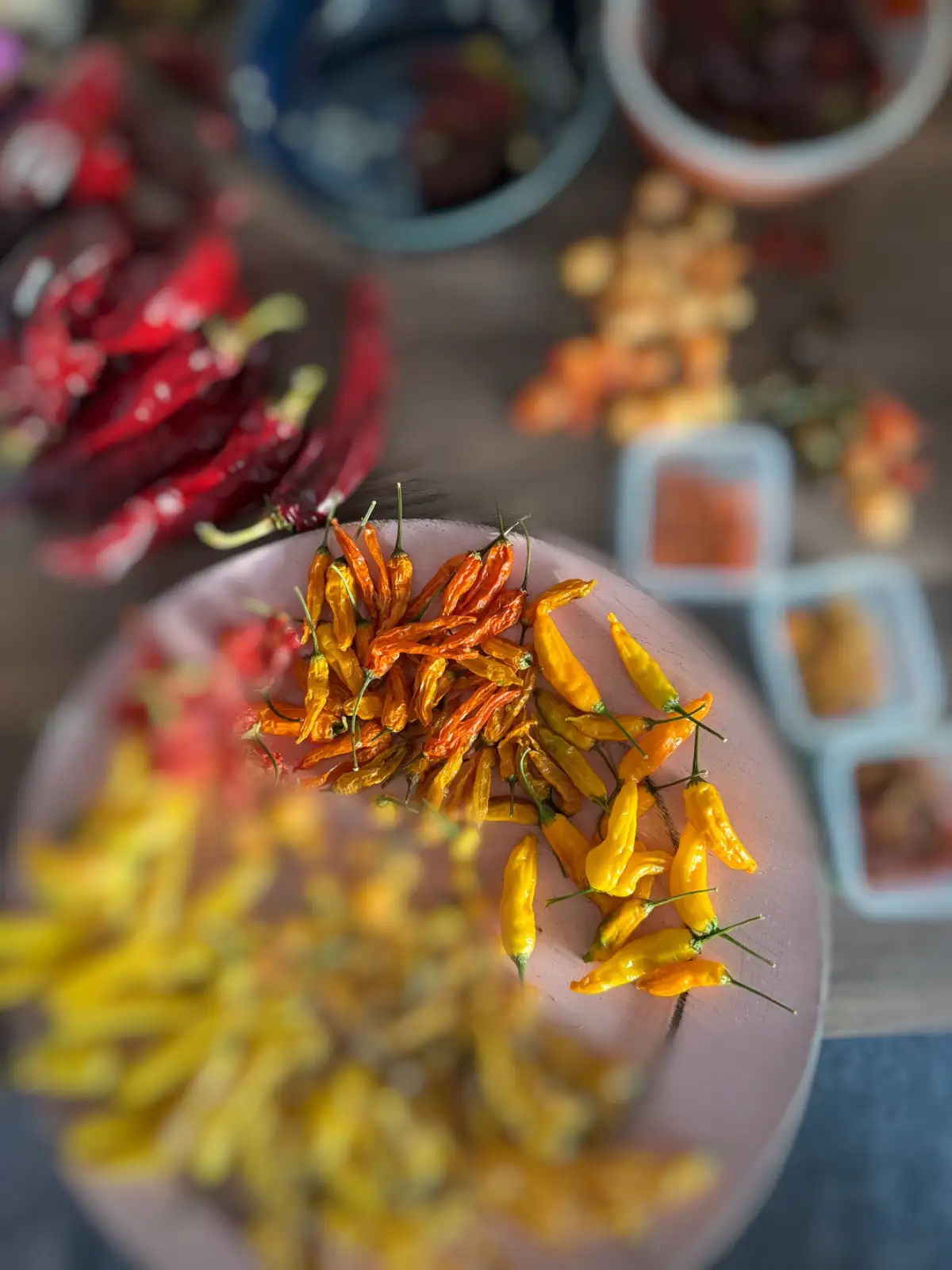 Aji Pineapple In Wuchs und Aussehen der Lemon Drop sehr ähnlich, weniger Zitrusaromen, dafür etwas tropischer, entfernt an Ananas erinnernd, aber wer typisches Ananasaroma erwartet wird leider enttäuscht sein. Schärfegrad: etwa 20.000 bis 30.000 Scoville (SHU). Für Salsas, Ceviche, getrocknet sehr gut als Salz. Tausch gegen folgende Chilisorten: MOA Scotch Bonnet, Charapita, Chiltepin (mit Herkunftsbezeichnung/Brown/Capuccino), Purple/Black Chupetinho/Biquinho, Arbol, Poblano, Anaheim oder Unkostenbeitrag für Versand, 1,00 Euro / 10 Samen, plus 1,00 Porto und Verpackung pro Sendung.
