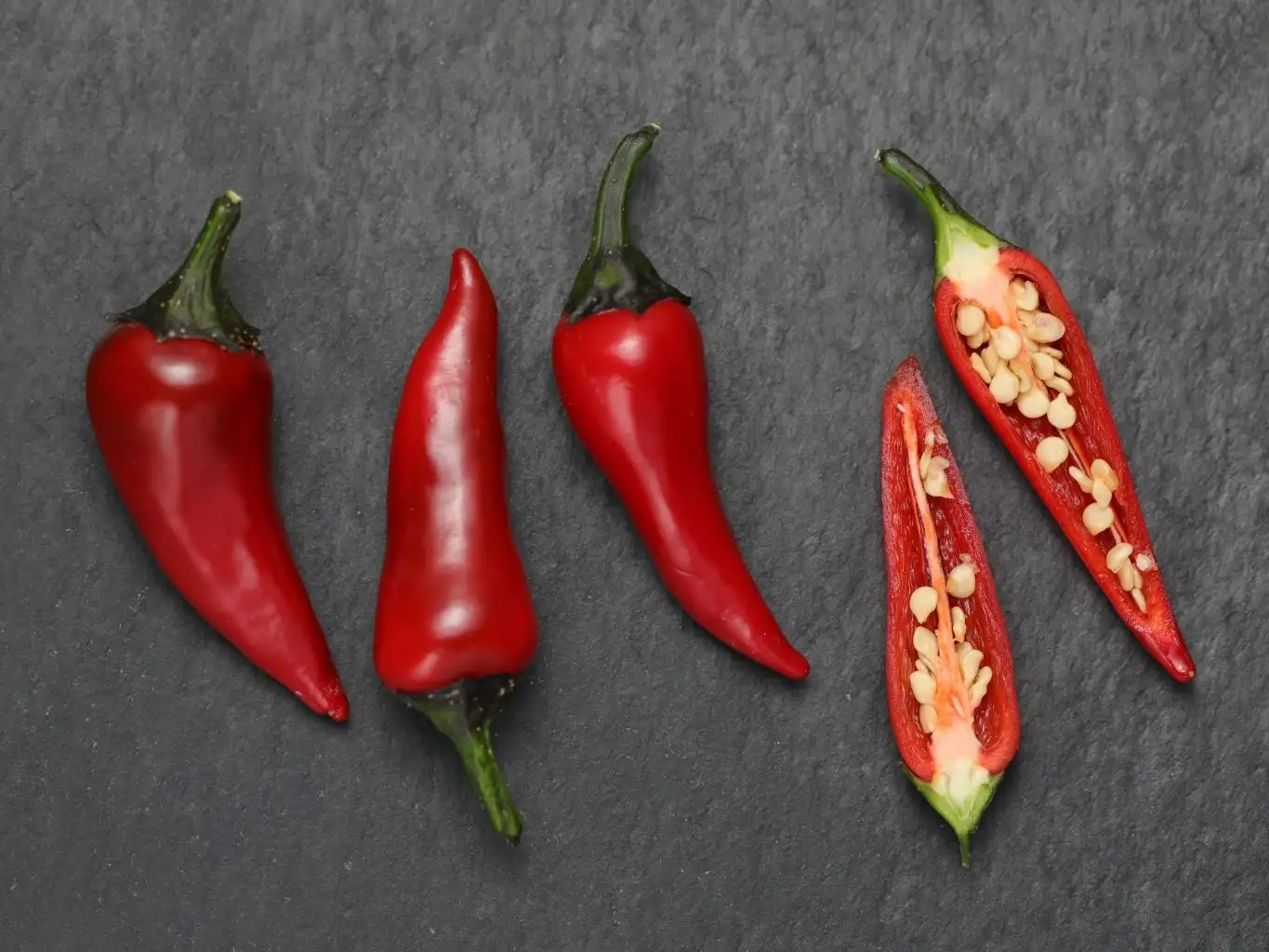 Capsicum annuum - Herkunft: unbekannt - Schärfe: 5-7/10 - Frucht: schwarz->rot, ca.40x20mm, konisch - Strauch: Höhe 50-60cm - Anbau 2025: Gewächshaus, Biodünger, kein Pflanzenschutzmittel