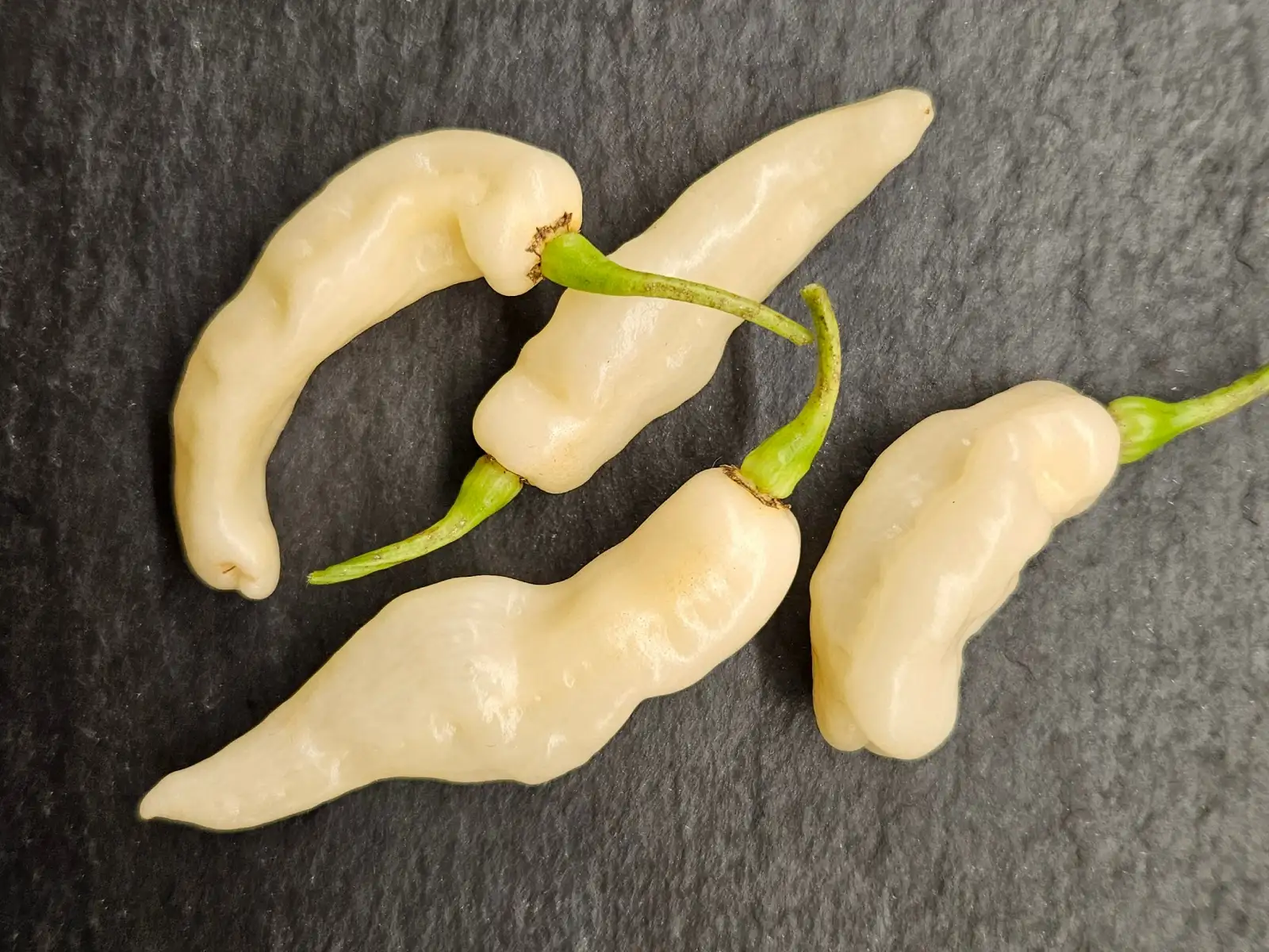 Capsicum chinense - Herkunft: Brasilien - Schärfe: 10+/10 - Frucht: hellgrün->creme, ca. 15x80mm - Strauch: Höhe 100cm - Anbau: indoor/semi-hydro/unverhütet