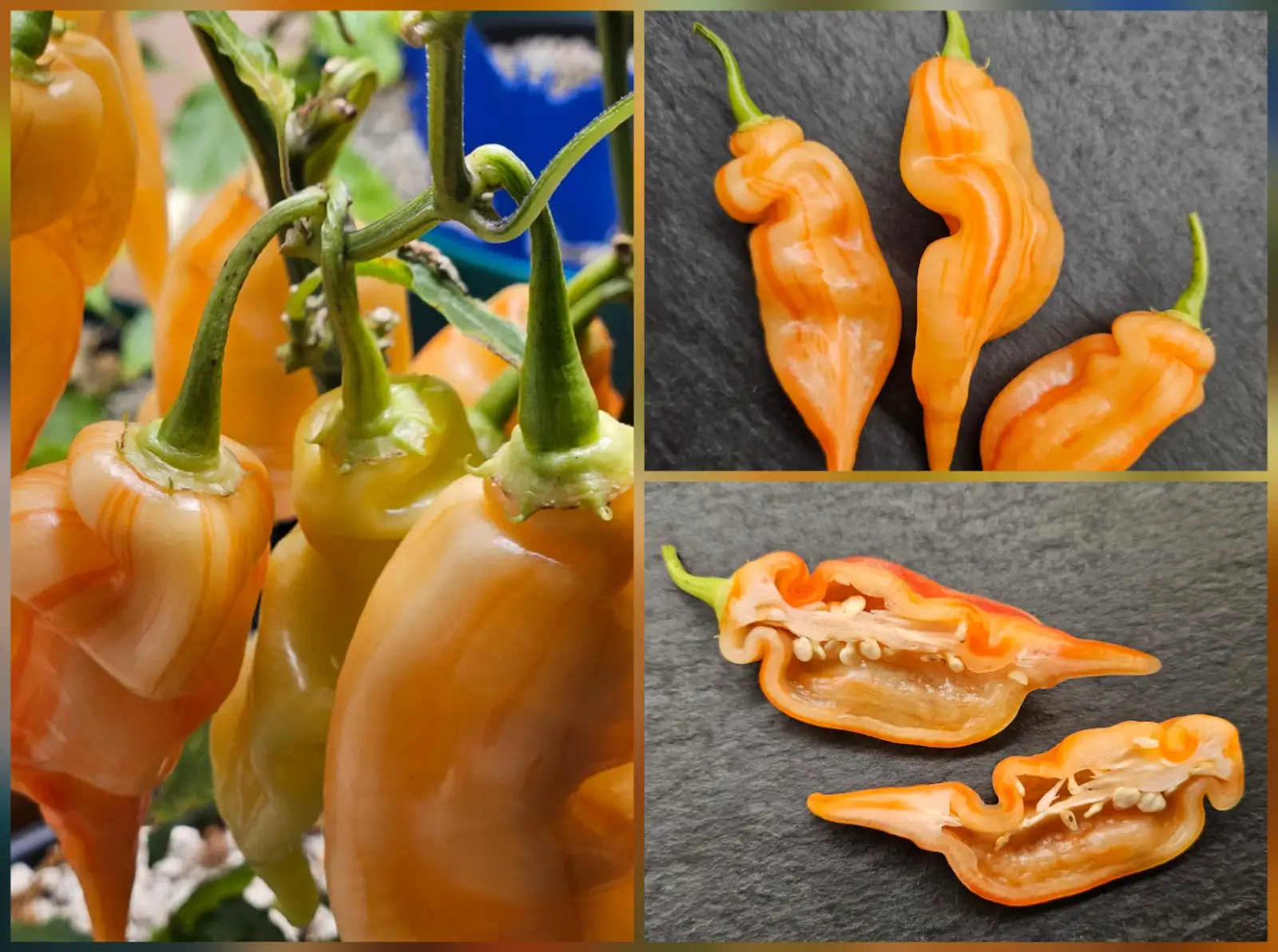 Capsicum baccatum - Herkunft: Wales/USA - Schärfe: 8/10 - Frucht: grün->orange, rot panaschiert, ca.130mm, länglich - Strauch: Höhe 80cm - Anbau 2025: indoor, semi-hydro (Pon), mineralischer Dünger, kein Pflanzenschutzmittel