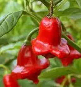 Diese außergewöhnliche Sorte produziert sehr viele der leicht scharfen glockenförmigen Chilis. Die bis zu 1,20 m hohen Pflanzen sind aufgrund der Form ihrer Früchte ein echter Blickfang im Garten. Die Früchte sind recht standfest und eignen sich daher sehr gut zum Füllen. Art: Capsicum baccatum Schärfe: 5 - 6 Reifung: Von grün zu rot Standort: Sonnig und warm