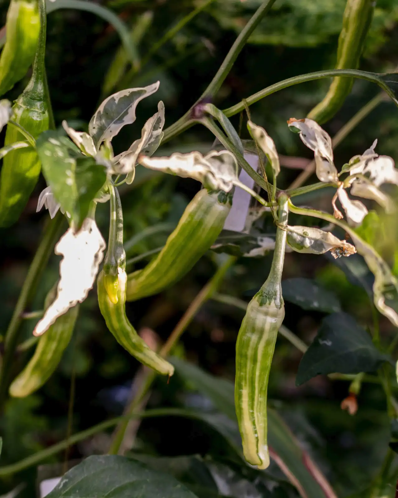 Interspezifisch, Variegata. FiFi Tabasco x Tiger Thunder Aktuelle Samen F6, in F5 phänotypisch stabil. Kreuzung und Selektion von Bryan Townshend. Sehr wüchsige und produktive Pflanze, wie üblich für Selektionen von Bryan. ~70-80cm, typisch schlacksig wie eine Annuum, allerdings vieltriebig. Interessanter, guter, eigener Geschmack. Früchte reifen von grün/weiss gestreift über orange/weiss gestreift nach Orange. Schärfe 5/10. Saisonliebling 2025! Interspecific, variegated. FiFi Tabasco x Tiger Thunder crossed and selected by Bryan Townshend. The current available seeds are F6, F5 was phenotypical and stable. Very strong growth, as typical for selections of Bryan, ~70-80cm. Grows skinny as a Jalapeno but will develop many side branches that reach full hight. Very interesting and unique flavor. Fruits ripen from green/white striped to orange/white striped before they fully turn orange. A very interesting variety with a heat level of 5/10. Also a season favorite!