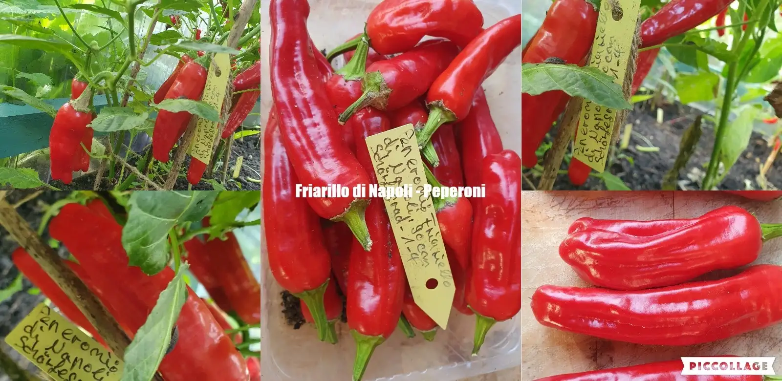 Peperonie Sorte: Friariello di Napoli Sind sehr leckere milde Peperoni aus der Region Neapel, Italien. Sie werden üblicherweise grün geerntet und dann ganz in Olivenöl gebraten bis sie Blasen werfen und leicht gebräunt sind. Auch zum Grillen gut geeignet. Voll ausgereift bekommen sie eine hellrote Farbe und einen zarten, süßen Geschmack. Reifung von grün zu hellrot, Schärfegrad 2. Robust und reichtragend, um die 90 cm hoch. Ab Mitte Februar bis Mitte März für die Vorkultur im Haus. Anzuchttöpfen mit einer feuchten Anzuchterde. Samen ca. 1 cm tief in die Erde legen und leicht mit Erde bedecken. Die Samen keimen am besten bei einer Temperatur von22/26 °C von etwa 10-14 Tagen. Nach der Keimung können die Sämlinge etwas kühler um 18 °C gestellt werden. Benötigen viel Licht sowie eine hohe Luftfeuchtigkeit, bis die Keimung abgeschlossen. Ab Ende Mai/Anfang Juni, nach den letzten Frösten, ins Freiland pflanzen.