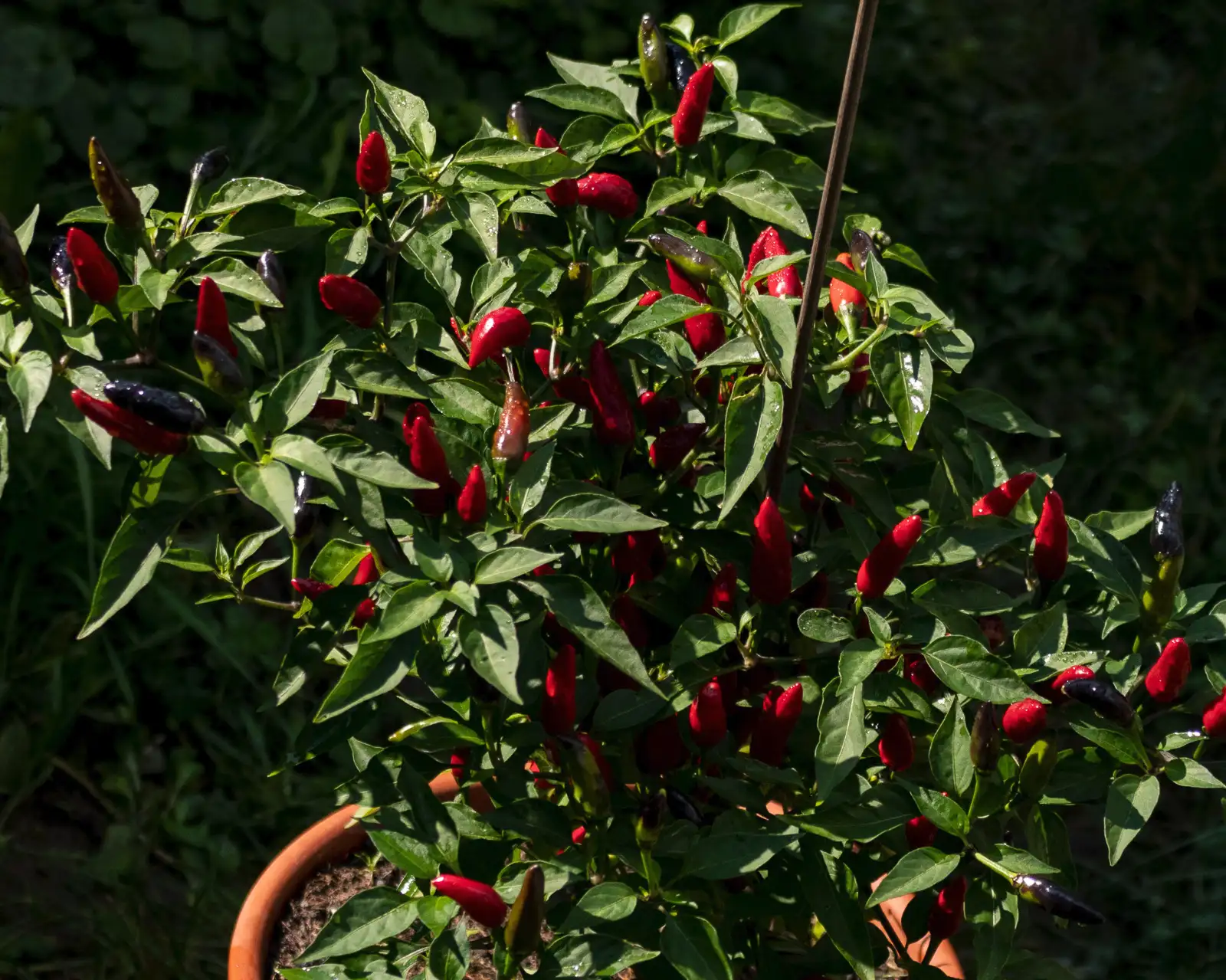 Capsicum Annuum Dekorativer Busch, geeignet auch als Topfkultur oder für Balkonkasten. Die zahlreichen kleinen Früchte reifen von Schwarz nach Rot, dunkelgrünes Laub. Reich tragend und eignet sich super zum trocknen/fädeln. Schärfe 4/10 Decorative bush, also grows well in pots. It's full of little fruits that ripen from black to red, dark green foliage. Very productive and good for drying/hanging . Heat level 4/10