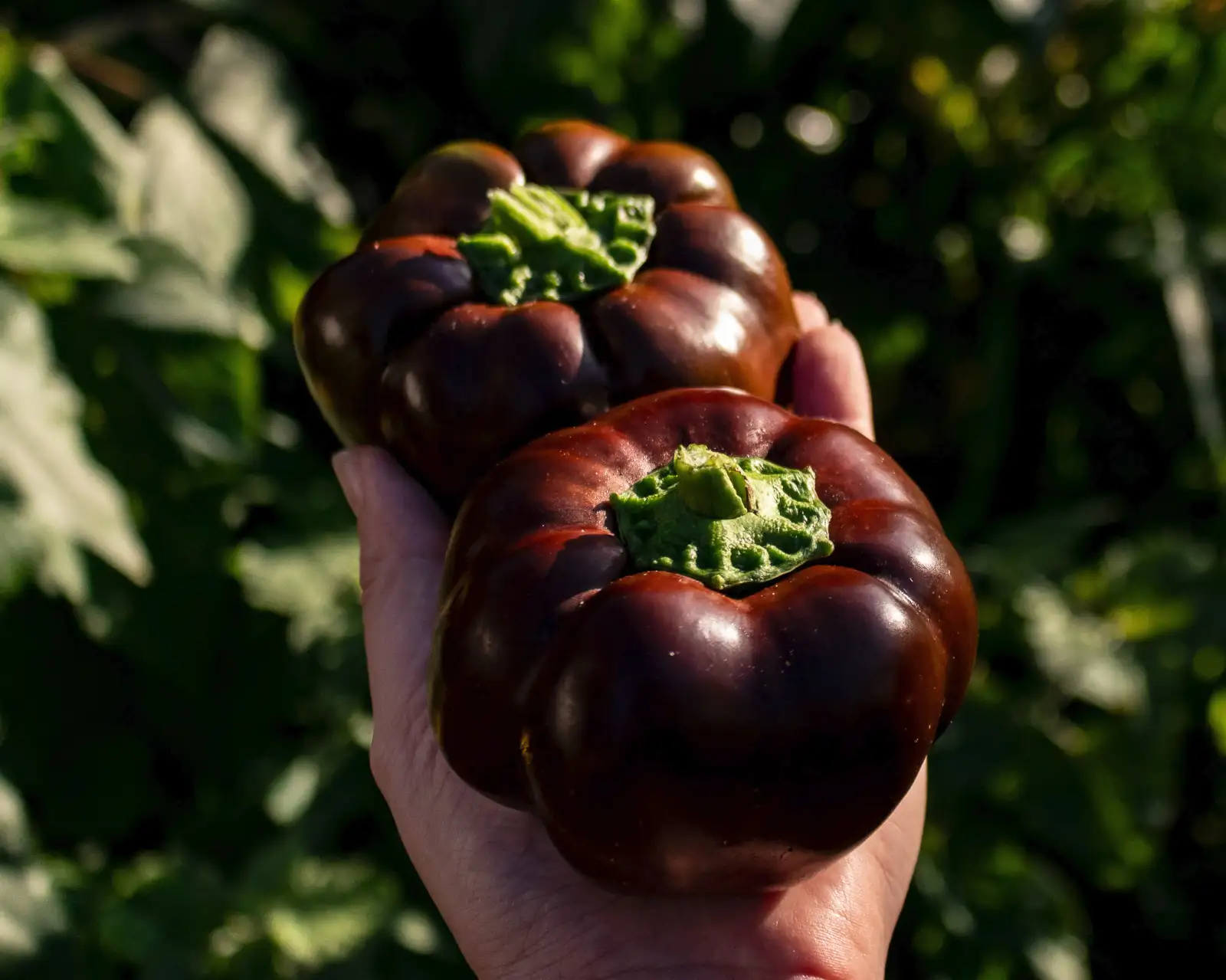 Capsicum Annuum Habe diese Linie als Sweet Chocolate X bekommen und finde sie bisher am besten unter den braunen Tomatenpaprika. Pflanze ist sehr wüchsig, 50-60cm und produktiv. Allerdings spät reifend wie die meisten Tomatenpaprika. Süss und dickfleischig. Schärfe 0. I got this line as Sweet Chocolate X and it's my favorite from the brown tomato peppers I tried so far. Grows strong and is productive, ~50-60cm but a bit late like most tomato peppers. Thick fleshed and sweet. No heat.