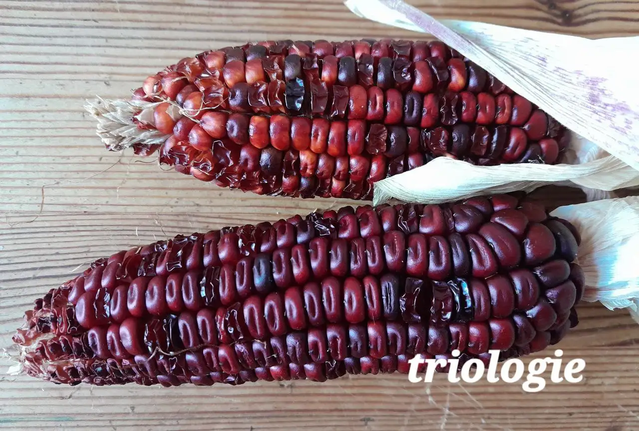 20 cm lange Kolben in den Farbevarianten weiß, bronzorange und rot, sehr hübsch und sehr süß, Ernte für den Verzehr: jung, wenn die Körner noch weich sind, frisch, gekocht oder gegrillt essen, schmeckt süß nach Mais