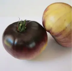 Beschreibung: Azul Blanco ist eine spanische Tomatensorte mit mittelgroßen, flach‑runden Früchten, die eine blassgelbe bis cremeweiße Grundfarbe mit violettem Kragen aufweisen. Die Früchte haben ein festes, ausgewogenes Geschmackprofil und besitzen eine angemessene Saftigkeit und balanciertes Aroma.