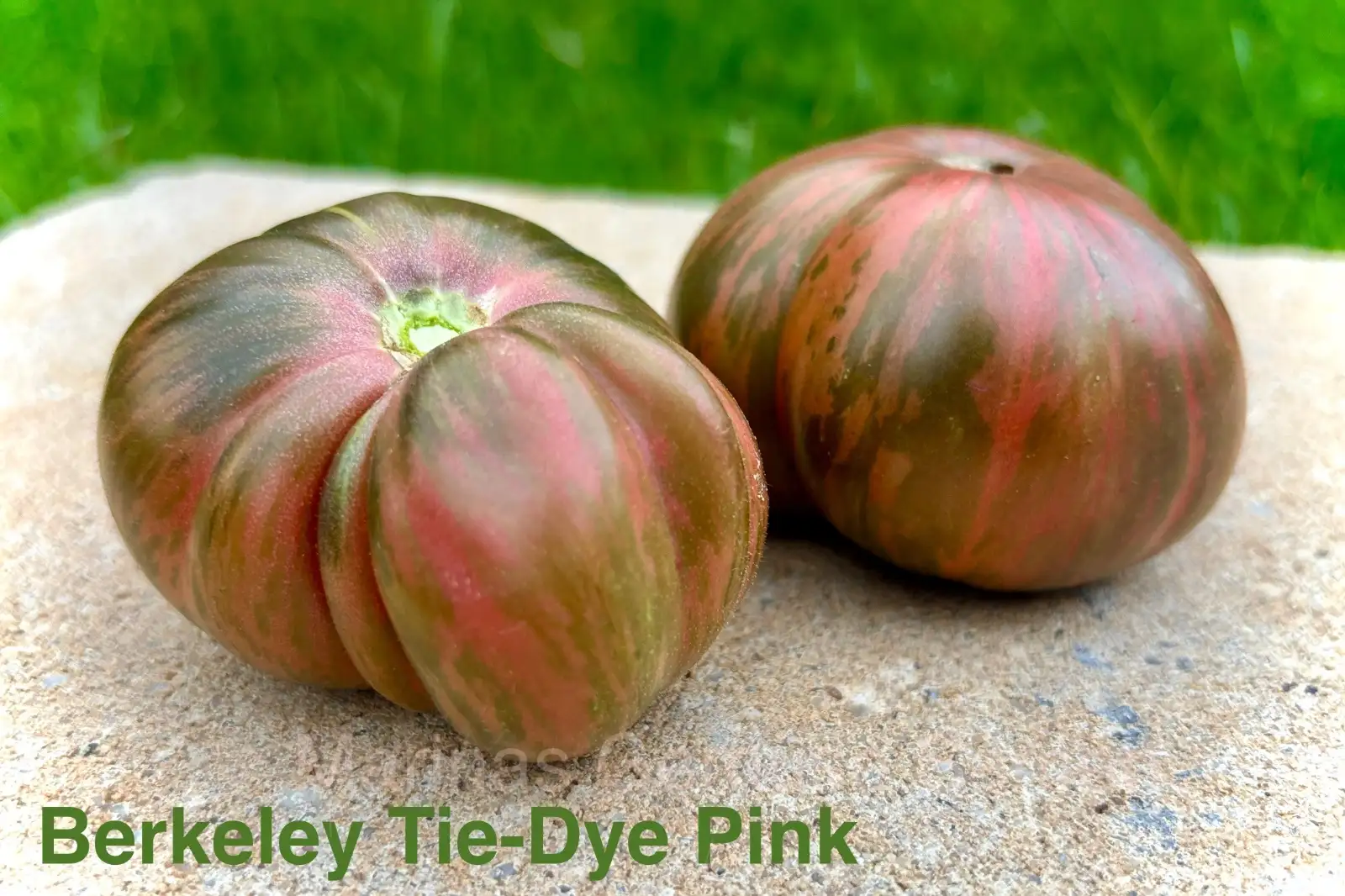 Berkeley Tie-Dye Pink nennt sich diese wunderschöne mehrfarbige Fleischtomate aus den USA. Es handelt sich hierbei um eine weitere, dunklere Zuchtlinie der beliebten Berkeley Tie-Dye von Bradley Gates aus Kalifornien. Die Früchte sind lila-rotbraun gefärbt und haben metallisch glänzende olivgrün-braune Schultern und Streifen. Die Sorte wurde 2008 erstmals bei den Seed Savers in den USA vorgestellt und angeboten. Die Pflanzen haben normalblättriges Laub und werden bei mir um die 180 cm hoch. Berkeley Tie-Dye Pink ist keine späte Sorte, sie benötigt von der Befruchtung bis zur Reife nur etwa 60 bis 70 Tage. An kräftigen Rispen wachsen jeweils 4 bis 8 Tomaten, die in der Regel 6 bis 10 cm groß und bis zu 300 g schwer werden. Samenfestes Saatgut, nur vegan und ökologisch gedüngt. 10 Samen = 1,50€ (Mindestabnahme) + Versand= 1,50€