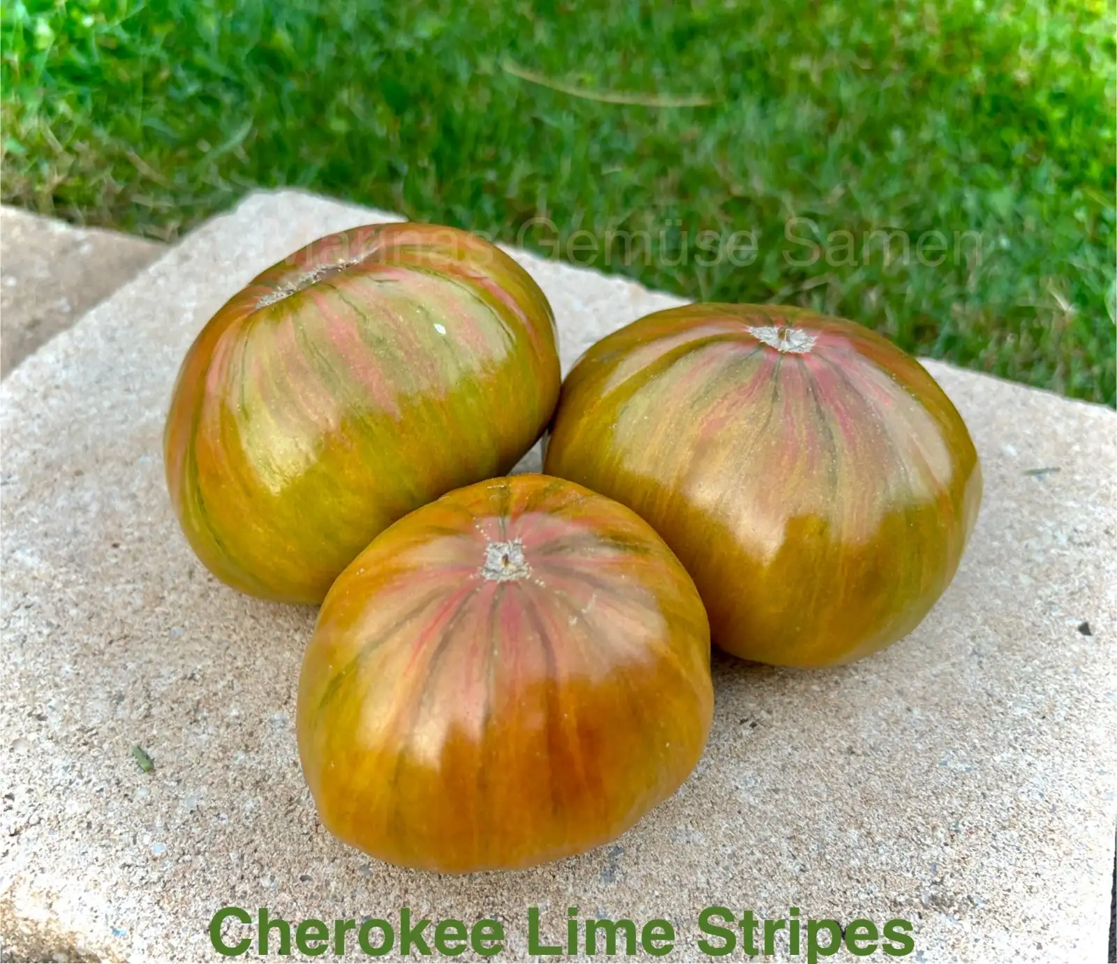 Cherokee Lime Stripes ist der Name dieser mehrfarbigen Schönheit aus Indiana. Die Fleischtomate stammt von Bill Jeffers aus Evansville und entstand vermutlich durch Selektion aus der Sorte Cherokee Green. Die Cherokee Lime Stripes produziert mittelgroße, grüngelbe Früchte, die von orangeroten Streifen überzogen sind. Die Pflanzen haben normales Laub und werden um die 2 Meter hoch. Von der Befruchtung bis zur Erntereife vergehen etwa 65 Tage. In der Regel sind die Früchte 6 bis 10 cm groß und bis zu 300 g schwer. Samenfestes Saatgut, nur vegan und ökologisch gedüngt. 10 Samen = 1,50€ (Mindestabnahme) + Versand= 1,50€
