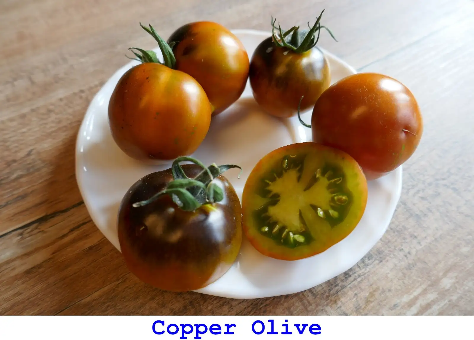 126 Copper Olive olive-schwarze Stabto-mate,Wild Boar Farms, USA, indeterminiert, Frucht bis 60 Gr., n Laub, sehr hoher Er-trag,guter Geschmack, lange Halbbarkeit. Anbau 2025 ©G-TOmaten
