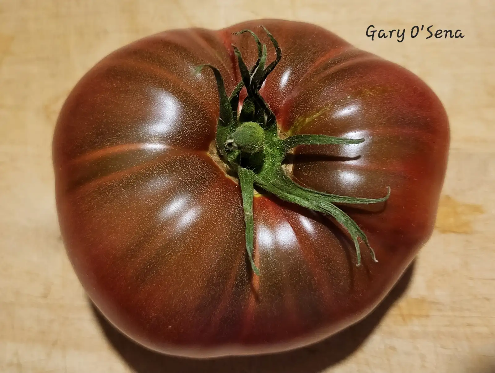 Gary O´Sena ist eine bräunlich-rosa Fleischtomate, die aus einer Kreuzung von Cherokee Purple und einer Brandywine enstanden sein soll. Die kartoffelblättrige Pflanze wurde etwa 1,3m hoch. Die ersten Früchte waren noch recht mild, aber mit dem besseren Wetter schmeckten sie angenehm aromatisch-würzig mit Süße und als es kurz mal richtig sommerlich wurde, schmeckte sie köstlich und intensiv. Samen UNVERHÜTET, von 2025