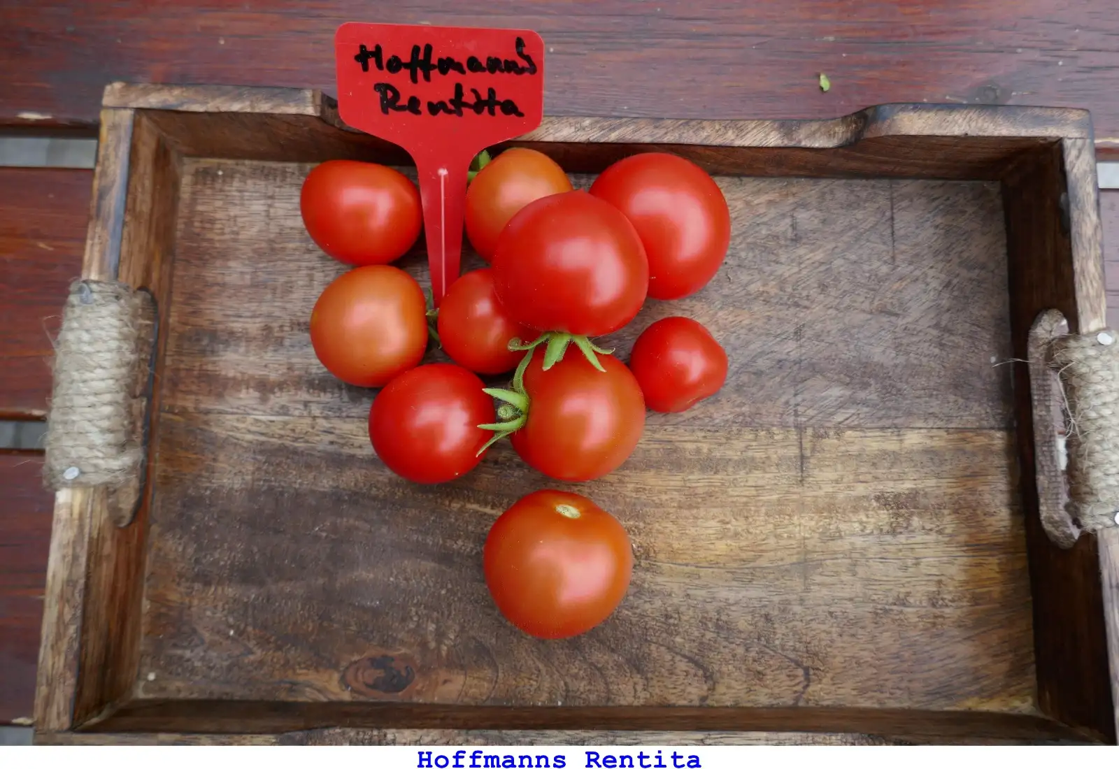 209 Hoffmanns Rentita Rote Buschtomate aus Deutschland, bis 50 cm, Früchte bis 80 Gr., normales Laub, süß saftig frisch Anbau 2023 ©G-TOmaten