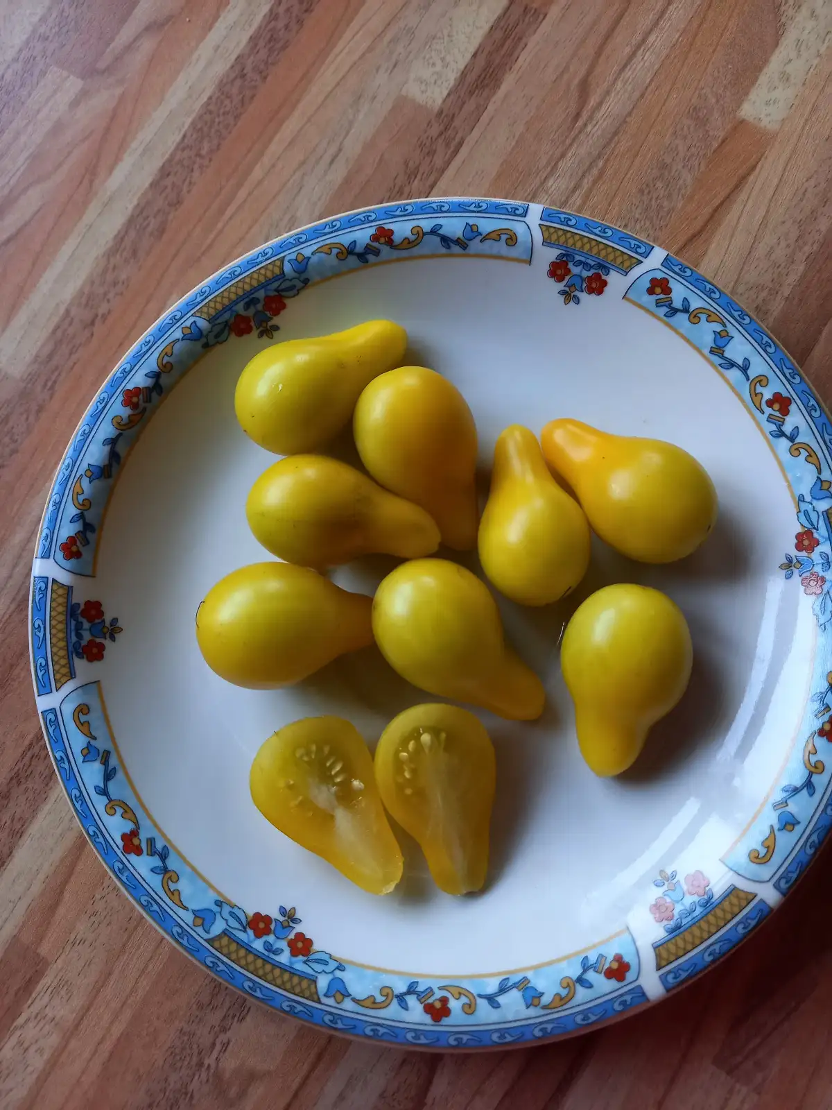 Züchtung aus Belgien 2020. Es sind kräftige Pflanzen, 2m hoch und bestens für das ungeschützte Freiland geeignet. Sie benötigen einen Stab und sollten etwas ausgegeizt werden, denn sie neigen zum wuchern. Die hellgelben, birnenförmigen Früchte hängen in Trauben an der Pflanze. Sie wiegen 10-15g, haben eine platzfeste Haut und dichtes Fleisch. Die ersten Birnchen sind Ende August reif und können bis Anfang November vernascht werden. Sie schmecken süß mit wenig Säure.