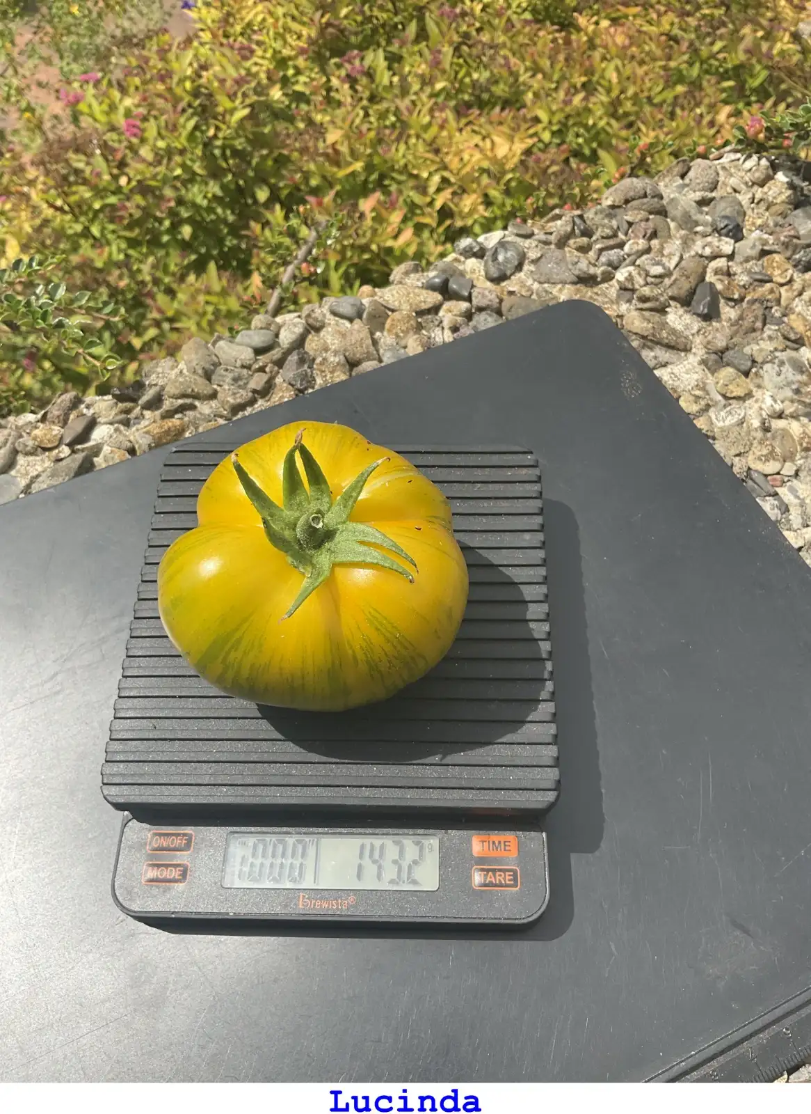 256 Lucinda Grün-gelb gestreifte Buschtomate von Fred Hempel USA, determiniert bis 1,2m, Möhrenlaub, Früchte bis 150 Gr, süß-würzig Anbau 2025 ©G-TOmaten