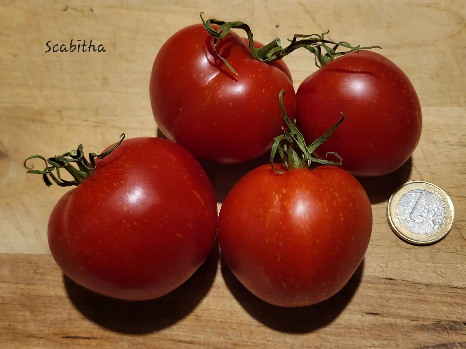 Scabitha ist eine rote Salattomate mit gelben Sprenkeln, die überdacht im Kübel 1,8m hoch wurde und einen guten Ertrag hatte. Die weichen, saftigen Früchte wurden 80(-100)g schwer und haben einen leckeren, feinen, mild-süß-aromatischen Geschmack, der im Herbst mit mehr Sonne noch besser wurde. Samen von 2023, unverhütet.