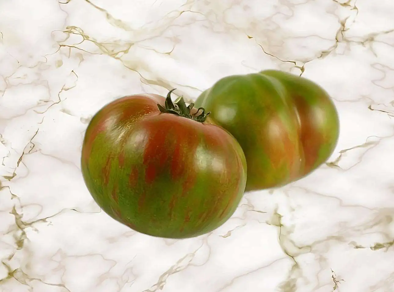 Dunkelrot-hellgrün gestreifte Dwarf-Tomate mit einem goldigen Glanz. Wenig Säure, kräftiges Tomatenaroma. Auch innen mehrfarbig, rotes mehr oder wenig stark getöntes Fruchtfleisch, grün umhüllte Samen. Kartoffelblättrig, Höhe ca. 1 m. Früchte lange lagerbar. Eine Sorte aus dem Dwarf-Projekt, Züchter: Blane Horton.