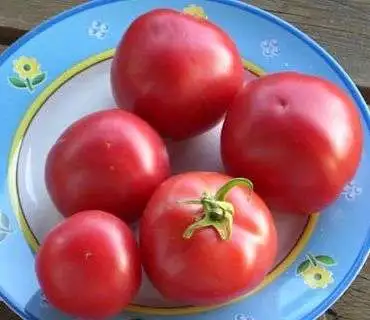 Rote Stabtomate. Eine hochwachende Stabtomate (3 m im September) aus Kasachstan mit roten Früchten. Hoher Ertrag an ca. 100 bis 130 g (teils 200 g) schweren Früchten. Die Früchte haben oft eine leichte Neigung zur Herzförmigkeit, innen leicht hohl. Sehr gute Gartensorte, auch wenn die Früchte am Stielansatz machmal (abhängig von der Witterung) einige Risse aufweisen.