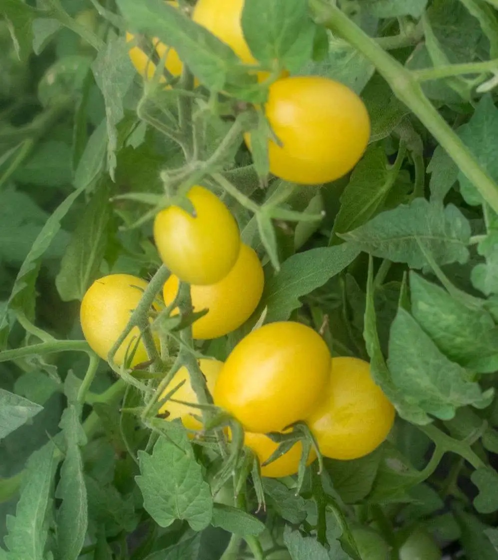 Früh reifende, ovale, weiße Cherrytomate, süßsaftig und sehr aromatisch. Normalblättrige, ca. 1,20 m hohe, reichtragende Pflanzen. Aus einer Kreuzung mit Snow White Cherry entstanden.