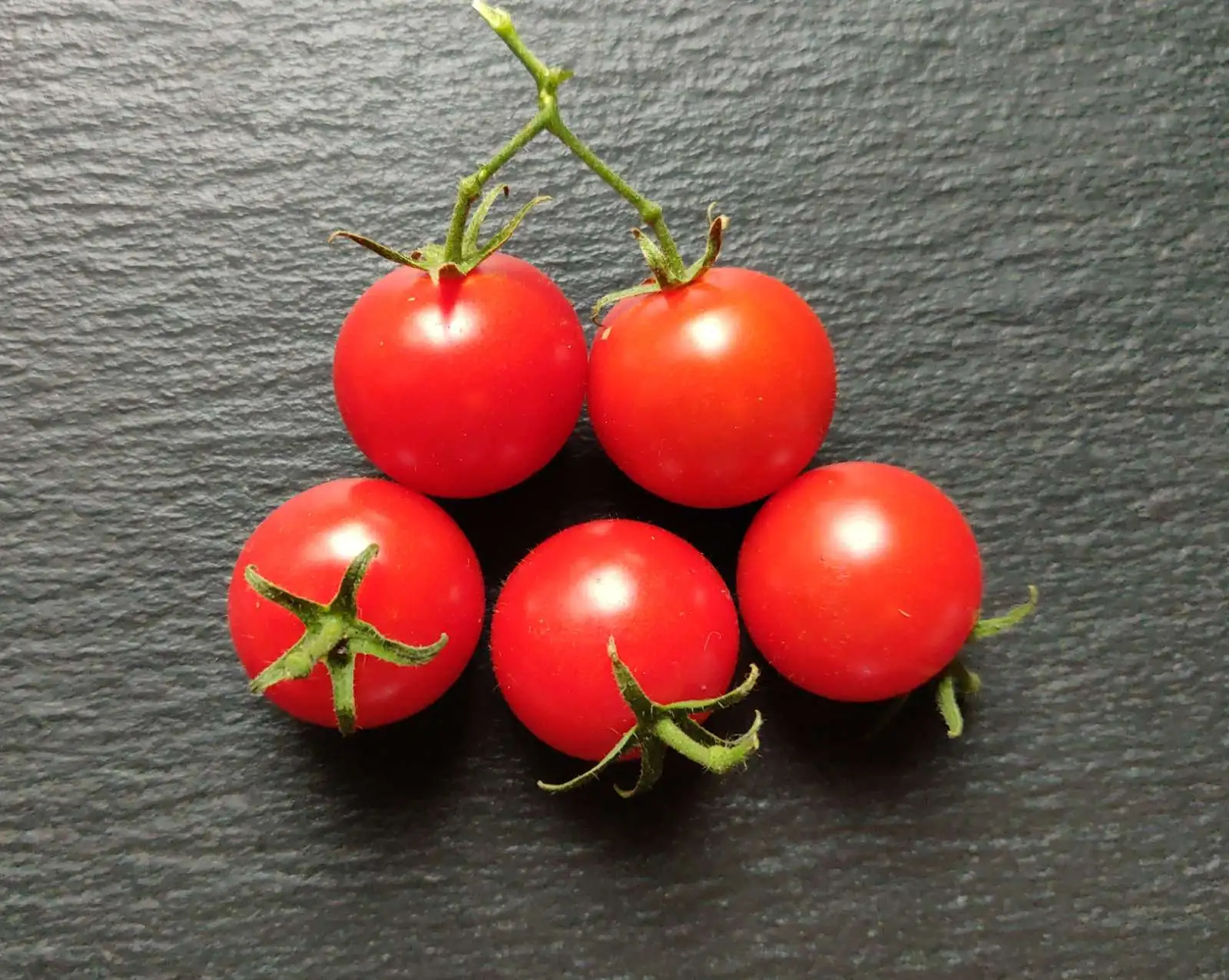 Kreuzung aus Harzfeuer und Roma. Runde Tomate, hellrot, ca. 30 g, glänzend, fruchtig, säuerlich, reich tragend. Früchte sind walnuß- bis tischtennisballgroß, mit einer dünnen, elastischen Haut.