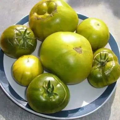 Mittelgroße grüne Fleischtomate. Schwachwachsende Stab- bis Stocktomate von gelbgrüner Farbe. Die Früchte sind platt, leicht gerippt und etwa zu 20 % von oben her grün geflammt. Unten mehr broncegelb bis grüngelb. Am Blütenpol mit kleinem korkigem Nabel. Im Freiland spätreifend und etwa 150 bis 200 g schwer. Diese Sorte ist wegen der geringen Wuchskraft ideal für kleinere Tomatenkästen. Dort werden die Früchte auch größer und reifen früher. Fleischige und fruchtige mittelgroße Fleischtomate. Soll laut Manfred Hahm aus Springfield/Ohio stammen.