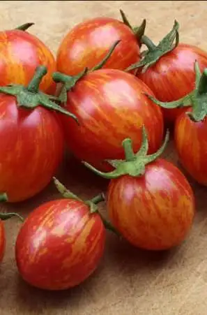 Geflammte Stab-Obsttomate. Eine der schönsten Stab-Obsttomaten. Kleine süß-saftige Früchte von runder bis hochrunder Form mit lachsroter Grundfarbe und goldenen Streifen. Gesunder Wuchs, normalblättrig. Recht platzfeste Früchte von 20 bis 25 g, die in einfachen Trauben hängen. Kein Massenträger, aber überaus wohlschmeckend und hübsch anzusehen. Eine Züchtung von Fred Hempel, von dem auch die Sorte Blush stammt.