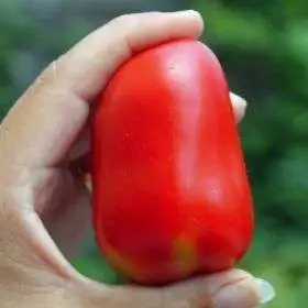 Stabtomate. Eine alte Tomatensorte aus Mitteldeutschland. Längliche Flaschentomate, ertragreich, mit viel Tomatenfleisch und wenigen Samen, sehr zart und geschmeidig, süßlich und fruchtig.