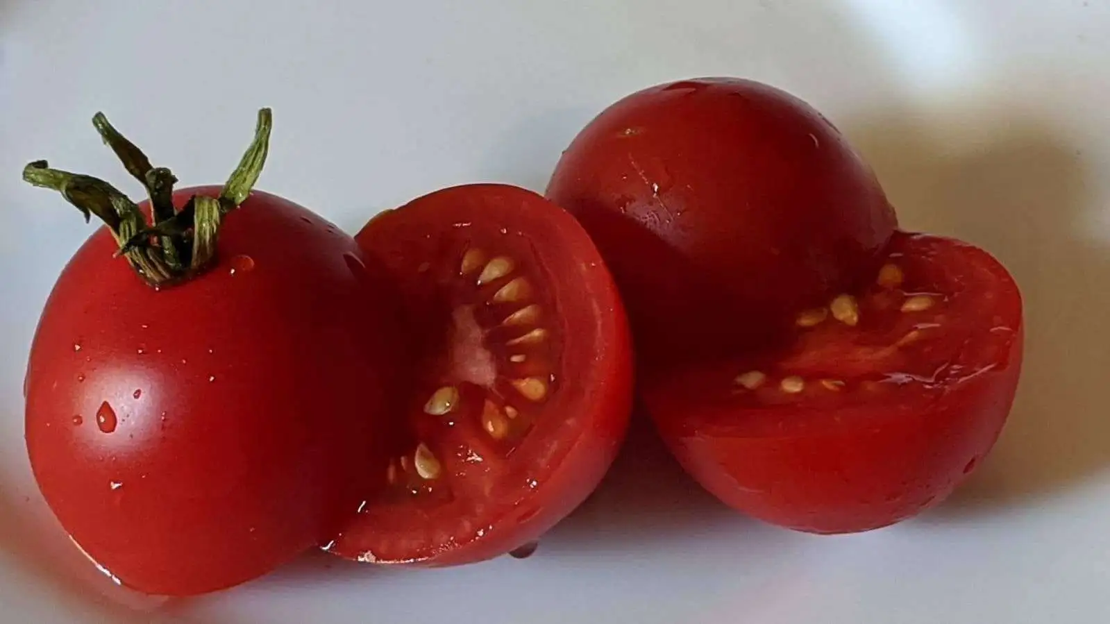 Rote, kleinfrüchtige Stabtomate mit nicht immer gleich großen und runden, manchmal etwas kantigen Früchten aus der Schweiz mit zumeist zwei Fruchtkammern.