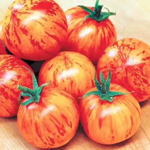 (Амурский Тигр, Amurtiger) – Kirschtomate aus Rußland, tischtennisballgroße, rote Früchte mit goldgelben Streifen, saftig, guter Geschmack.