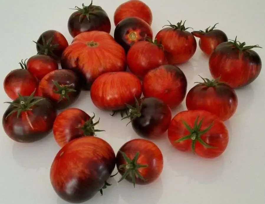 Viertelhoch, blauer Tri-Color-Typ. Kleinere Fleischtomate mit interessanter Färbung. Die runden bis leicht plattrunden Früchte sind leicht gerippt und haben zumeist eine violettblaue Kappe. Die restliche Frucht ist rot-gelb geflammt. Insofern ist die Frucht dreifarbig (unreife Früchte sind blau-grün). Das Laub ist oft bläulich überhaucht. Die Wuchshöhe ist begrenzt – meist werden die Pflanzen nur knapp über einen Meter hoch.