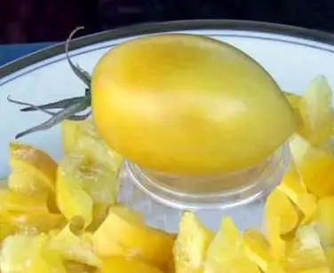 Gelbe Stabtomate. Eine längliche, in etwa keilförmige Tomate mit einer stumpfen, ausgezogenen Spitze am Blütenpol. Fahl- bis hellgelbe Früchte. Etwa zwischen 85 und 180 g schwer. Sehr fleischig, wenige Samen. Fruchtlänge etwa 80 mm (teils auch mehr), Durchmesser etwa 55 mm. Meist drei Fruchtkammern. Weich, saftig. Für warme Lagen oder Hauswand, ansonsten nur mittlerer bis geringer Ertrag. Historische Sorte mit außergewöhnlicher Fruchtform, vor über einem Jahrhundert in Scott County, Virginia/USA entstanden.