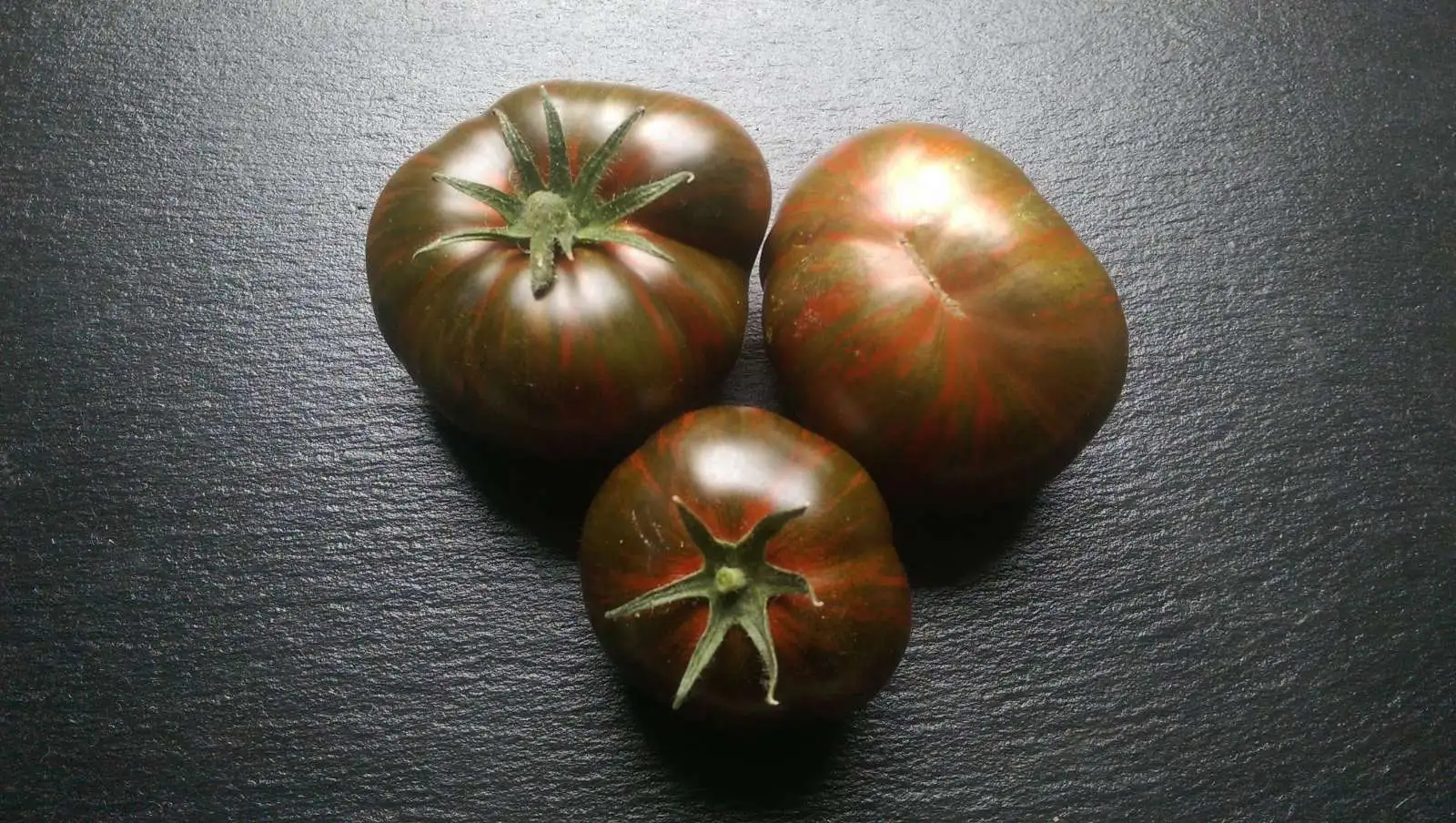 Dunkle Stab-Fleischtomate. Eine Fleischtomate von braunroter Farbe, die zudem mit noch dunkleren, schwarzolivfarbenen Streifen durchzogen ist. Plattrunde, unterschiedlich stark (meist aber schwach) gerippte Früchte, die bis zu 200 g wiegen. Allenfalls mittelhoch wachsend. Sehr guter Geschmack, doch etwas später reifend, daher nur für den geschützten Anbau zu empfehlen.