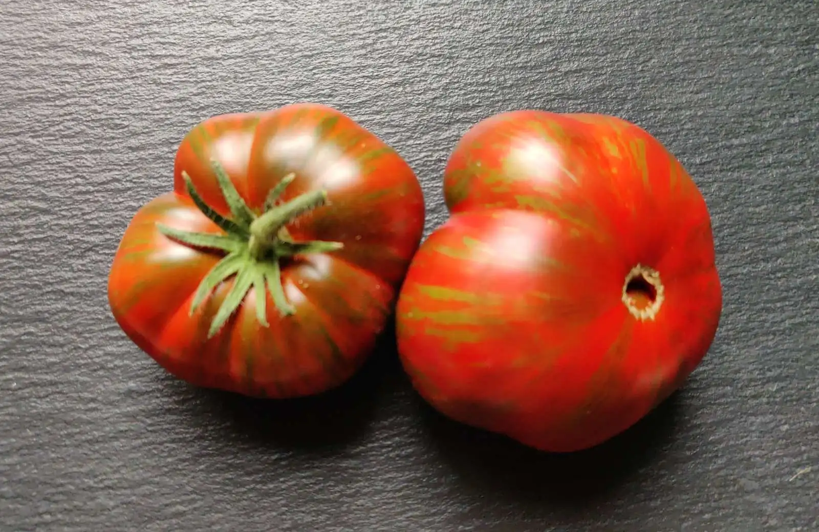Wenig bekannte Sorte aus den USA, entwickelt von John Siegel, Ohio, der auch der Züchter von Chocolate Stripes ist, die weniger rund und mehr gerippt aussehen. Mittelgroße Früchte von ca. 250 g, dunkle schokoladenbraune Farbe, unregelmäßig dunkelgrün gestreift. Mehr oder weniger abgeflacht, oben gerippt, pralle Schultern. Lilafarbenes Fleisch, das rosa marmoriert ist. Intensiver und ausgewogener Geschmack. Mittelgroße Pflanzen.