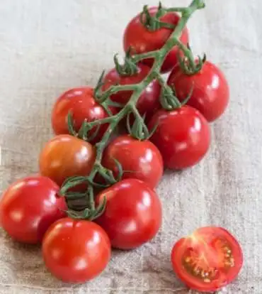 Rosarote Nektar-Cherrytomate. Starkwüchsig und widerstandsfähig gegen Krankheiten. Die glänzenden, äußerst wohlschmeckenden Früchte erreichen ein Fruchtgewicht von 20 g.